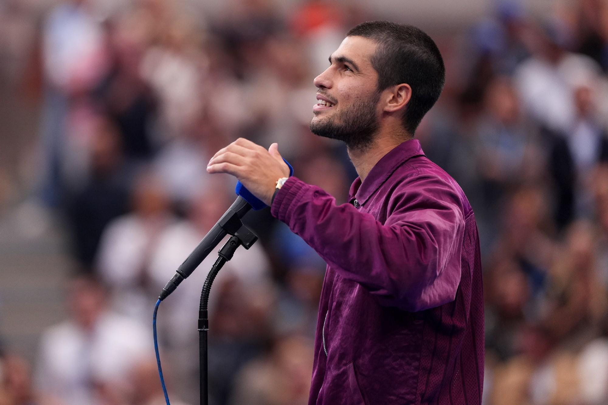 在2025年美国网球公开赛男子单打决赛3-1击败辛纳成功夺冠之后,阿尔卡拉斯在颁奖仪式上进行了发言。